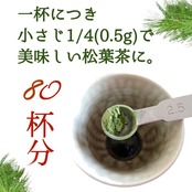 小さじ1/4~をお湯や水でといて松葉茶にすると、松そのままの芳香、風味が味わえます。松の風味をいかすためあく抜きはしておりませんので、胃腸の弱い方は少量ずつお試しください。また完全には溶けませんので、粉っぽさが気になる方は茶こしでこしてお飲みください。